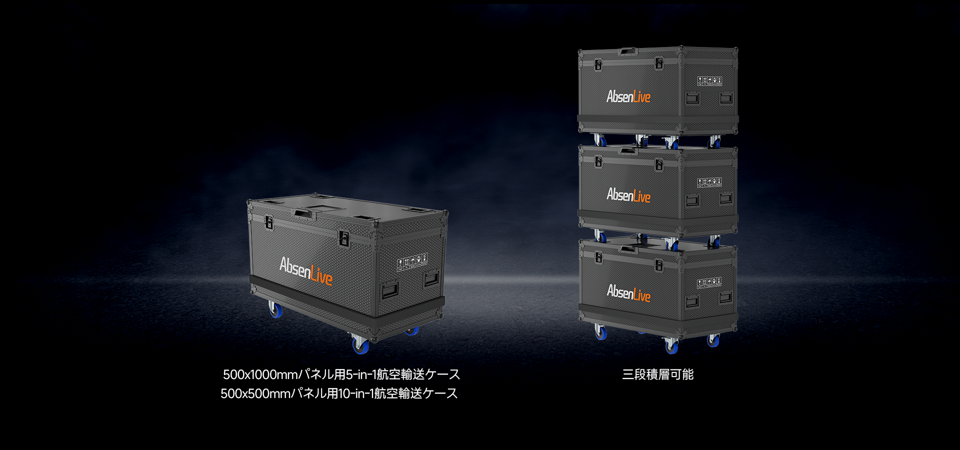 PL3.9 Pro V3では、ツアー運用に対応した保護機能を備えたオプションのフライトケースソリューションをご利用いただけます。500×1000mmパネル用5-in-1ケースと500×500mmパネル用10-in-1ケースの2種類を用意。いずれも実績ある耐久性設計により、輸送時における機器の保護を実現します。